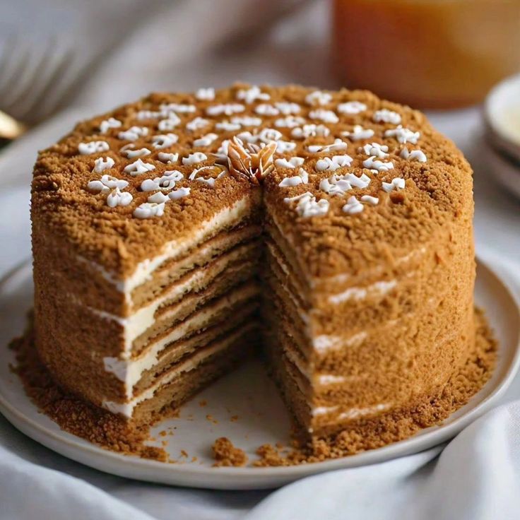 Large celebration honey cake with multiple soft cream layers.