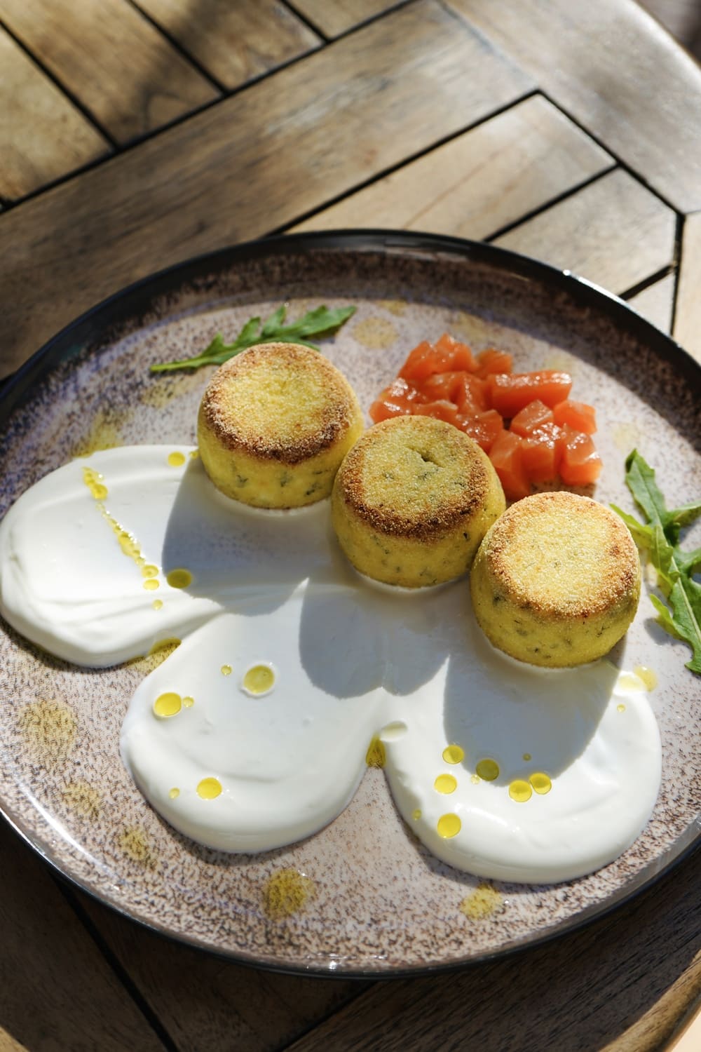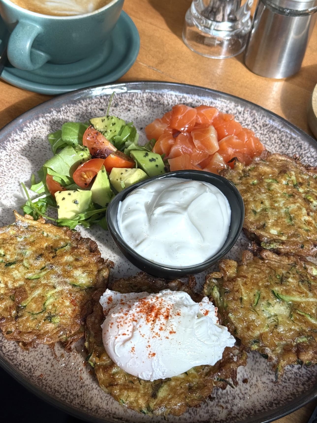 Golden zucchini pancakes paired with light, salty salmon.