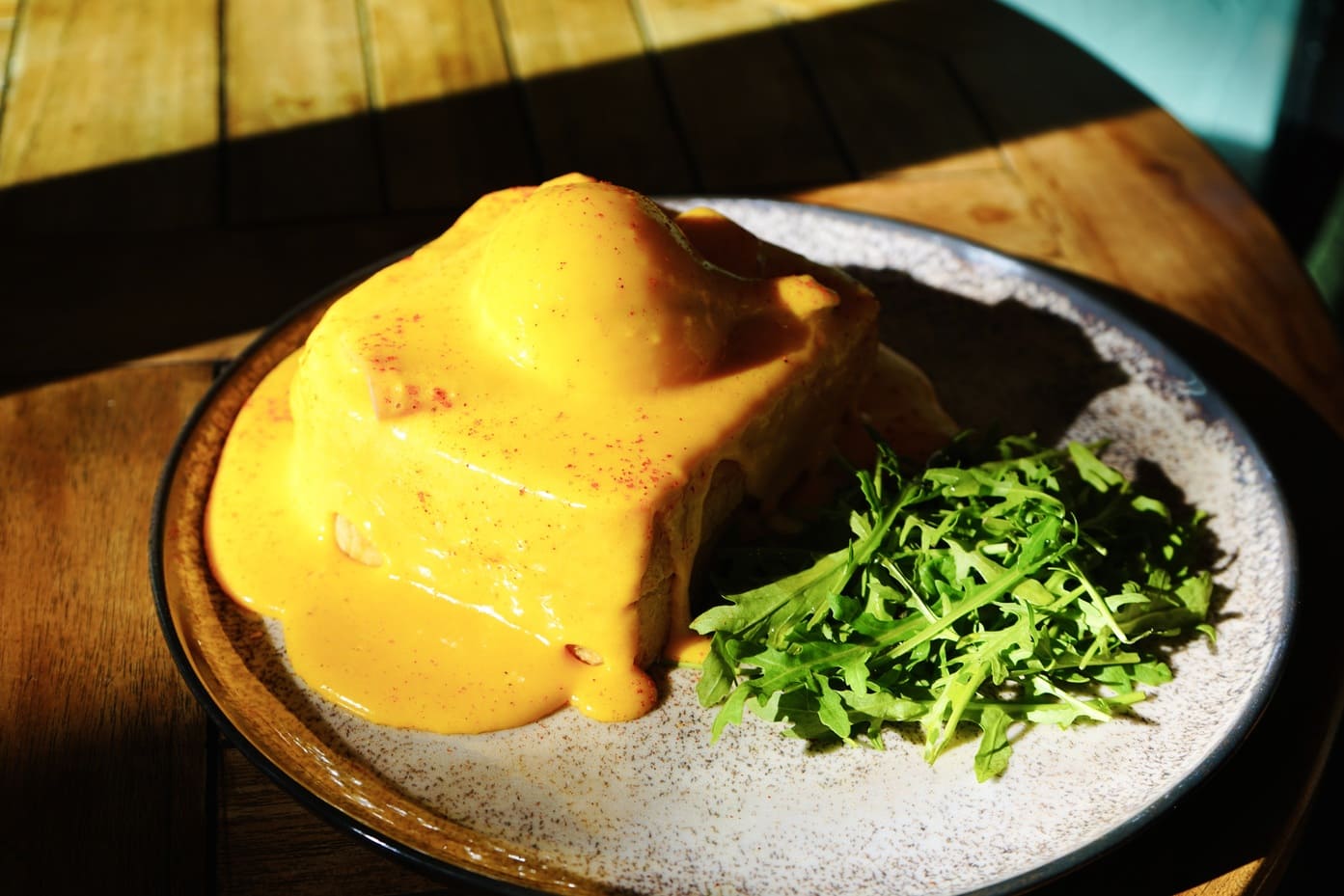 Poached eggs on toast with silky hollandaise and a warm finish.