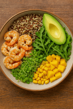 Warm, nourishing bowl of quinoa topped with tender shrimp.