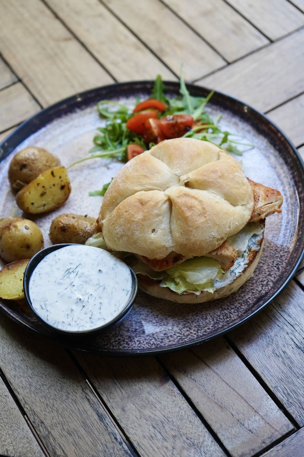 Soft bread filled with tender chicken and light, fresh toppings.
