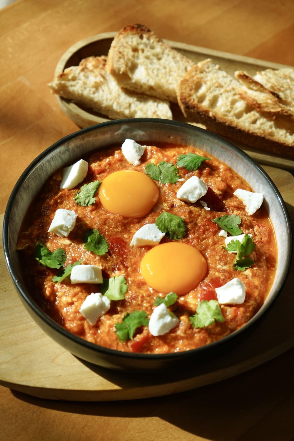 Eggs simmered in a rich tomato-pepper sauce with warm spices.