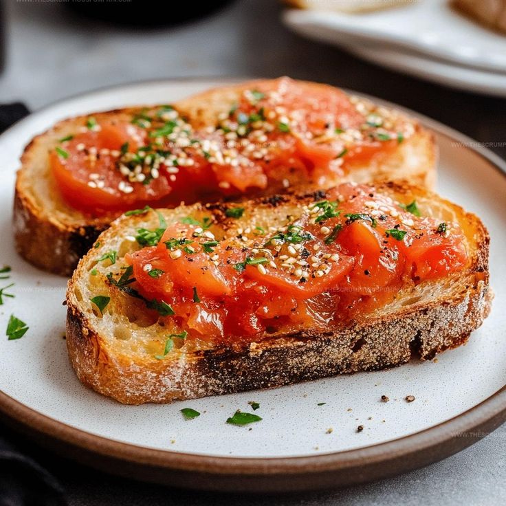 Crispy toast topped with tomate, olive oil and balanced seasoning.